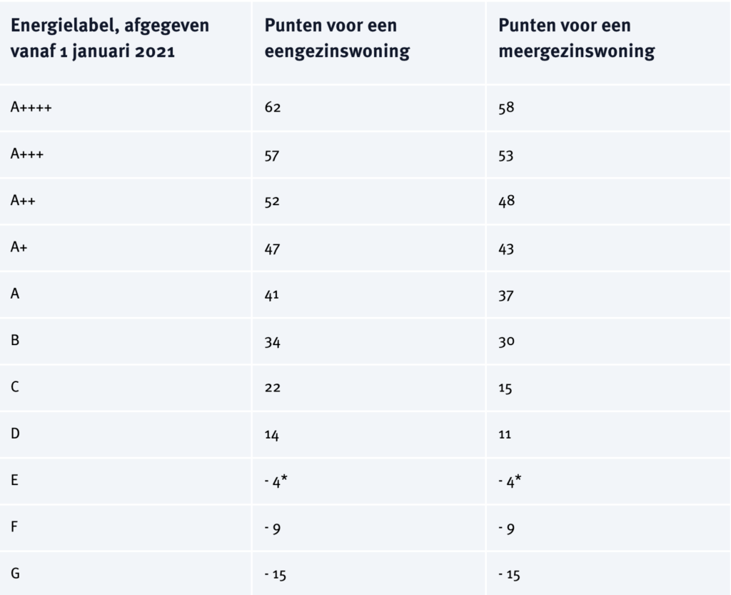 Voor verhuurders betekent dit dat het energielabel steeds zwaarder gaat meewegen in zowel de verhuurvoorwaarden als de financiële waarde van een woning. Het blijft verplicht om bij verhuur een geldig energielabel te kunnen overleggen, maar de energieprestatie is ook een belangrijk onderdeel van de waarde en de maximale huurprijs. Dat komt doordat het label direct is gekoppeld aan het woningwaarderingsstelsel (WWS). Een woning krijgt punten op basis van verschillende kenmerken, waaronder oppervlakte, voorzieningen en energieprestatie. Hoe beter het label, hoe meer punten en dus hoe hoger de maximale huur; een slecht label zorgt juist voor aftrek. Een woning met label A krijgt 41 punten (eengezinswoning) of 37 punten voor een meergezinswoning, terwijl een woning met label G een aftrek van 15 punten heeft. De grens tussen gereguleerde en vrije sector ligt rond 186–187 punten (dus meer dan € 1.184,82 huur in 2026). Een beter label kan er dus voor zorgen dat een woning net wél of juist níet in de vrije sector valt.